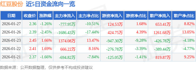 证券之星消息,截至2026年1月27日收盘,红豆股份(600400)报收于2.36元◁,下跌1◆▪.26%,换手率1.37%,成交量31.39万手◆▽▼,成交额7405…▽.31万元★。