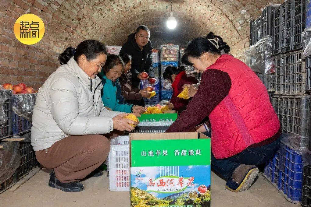 顺着山梁往西北走,二十里外的高西沟村,果农高乃柱的果库里也热闹得很。乡亲们围坐在成堆的纸箱旁,手上的活儿麻利又娴熟,分拣的挑得仔细、套保护网的动作轻快、封箱的攥得紧实,各忙各的,还时不时唠两句家常,满屋子都是欢喜劲儿。