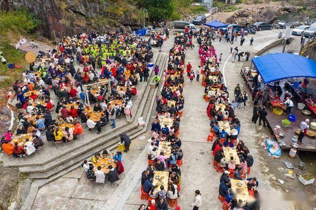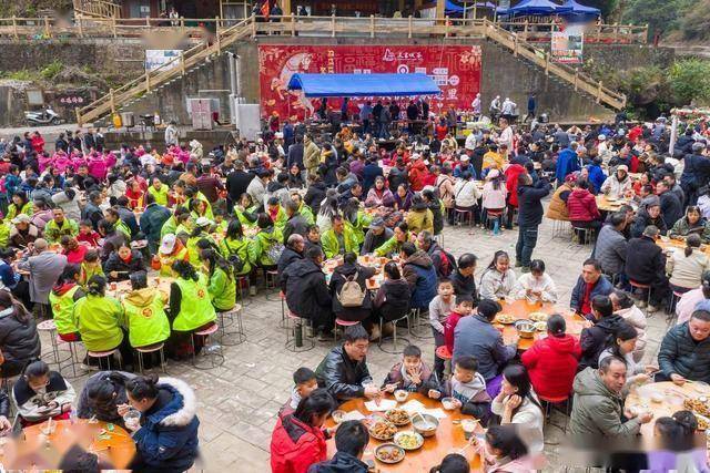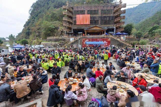 2026年2月7日,马年新春的暖意尚未铺满神州大地,广西梧州市蒙山县的天书侠谷景区,早已被沸腾的人声与浓郁的肉香裹满。剑潇阁演艺场里,青山为幕、流水为弦,一百桌宴席沿着广场与室内有序铺开,上千人围坐一堂,手中的筷子伸向冒着热气的土猪佳肴,欢声笑语顺着山谷飘向远方,这场千人共赴的全猪宴,不仅是一场舌尖上的盛宴,更是一次藏着蒙山侠骨与瑶乡温情的文旅突围,在新春文旅内卷的浪潮中,走出了一条独属于这座武侠小城的破圈之路。